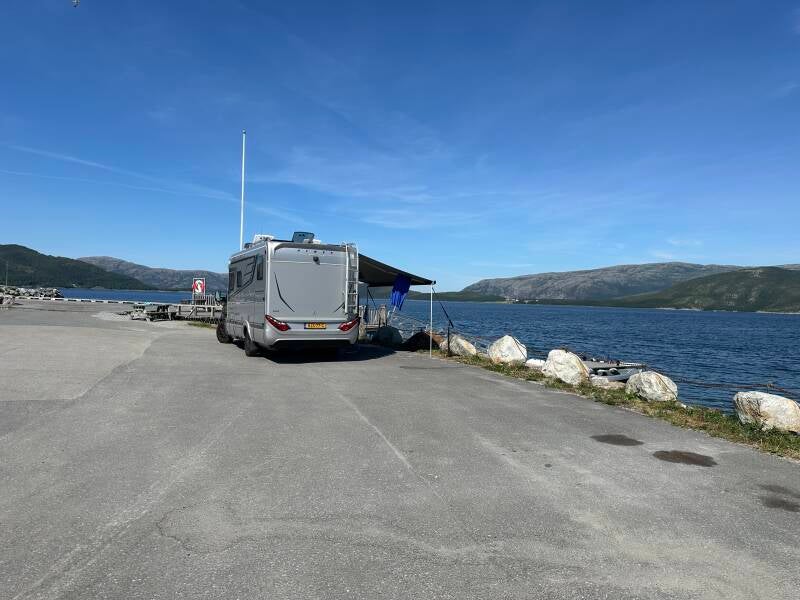 Naast ons staat een stel uit Zuid-Duitsland, ook onderweg richting de poolcirkel. Ze slaan de Noordkaap over, maar hebben zeven weken de tijd, dus gaan waarschijnlijk wat sneller dan wij. Even gezellig met de man staan praten — eerst in het Engels, maar toen hij doorhad dat ik ook wel wat Duits sprak, schakelden we over. Altijd leuk, zulke spontane ontmoetingen onderweg.