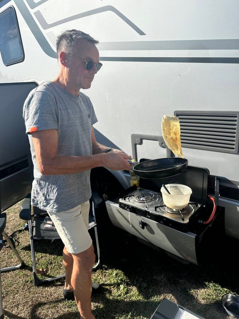 Onze lunch was dit keer lekkere pannenkoeken met spek. Ron maakte er een showtje van.