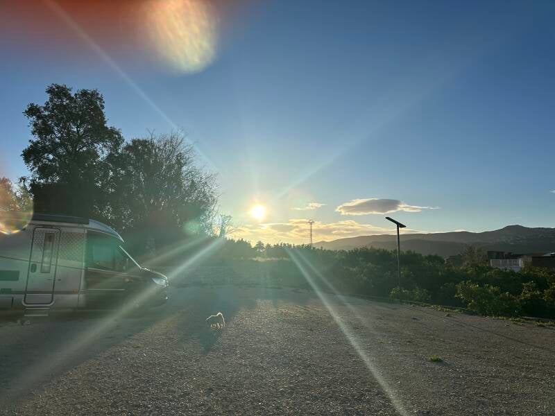 We zijn beland op de plek waar we vannacht kunnen overnachten. Even ter info voor mijn broertje: het is plek 03760 van Park4Night bij Ondara. We hebben nog lekker wat mandarijnen gesnoept en nu het weer begint af te koelen, gaan de luikjes weer dicht. Helaas geen zee geluiden.